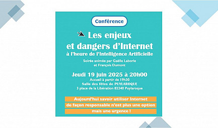 Conférence - Les enjeux et dangers d?Internet à l?heure de l?Intelligence Artificielle Soirée animÃ..Jeudi 27 mars 2025 à 20h00 -  Accueil à partir de 19h30 -  Salle de réunion CENTHECO - 3600 Route de la Vitarelle, 82000 Montauban