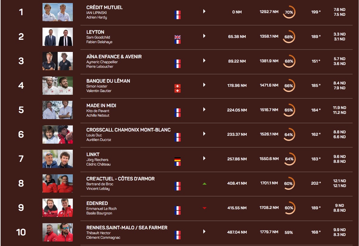 Partis grands favoris du Havre, Thibaut Vauchel Camus et Frédéric Duthil ont rapidement pris les choses en main. Premier sur la ligne de départ, premier à Etretat et impérial dans la descente musclée de la Manche, le duo confirme d’emblée sa maîtrise du sujet. En tête jusqu’à Gibraltar, avec jusqu’à 70 milles d’avance sur ses deux poursuivants, Solidaires En Peloton-ARSEP a ensuite souffert dans le passage de la dorsale qui régissait l’entrée dans l’alizé. Plutôt que d’accepter de recroiser derrière Primonial et Groupe GCA Mille et un Sourires après ce petit épisode tactique, ils préfèrent suivre leur option à fond, traversent les Canaries et perdent beaucoup de terrain quand il faut se recaler dans l’ouest pour passer le Cap Vert et rejoindre le Pot-au-noir.