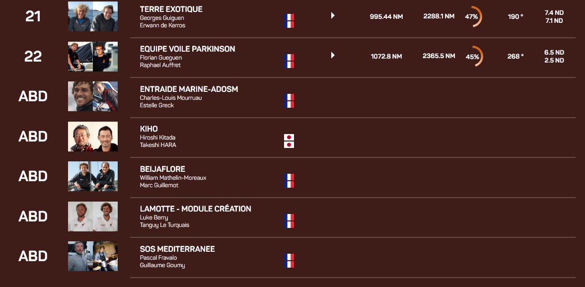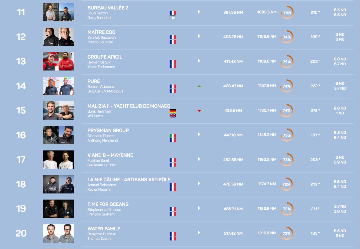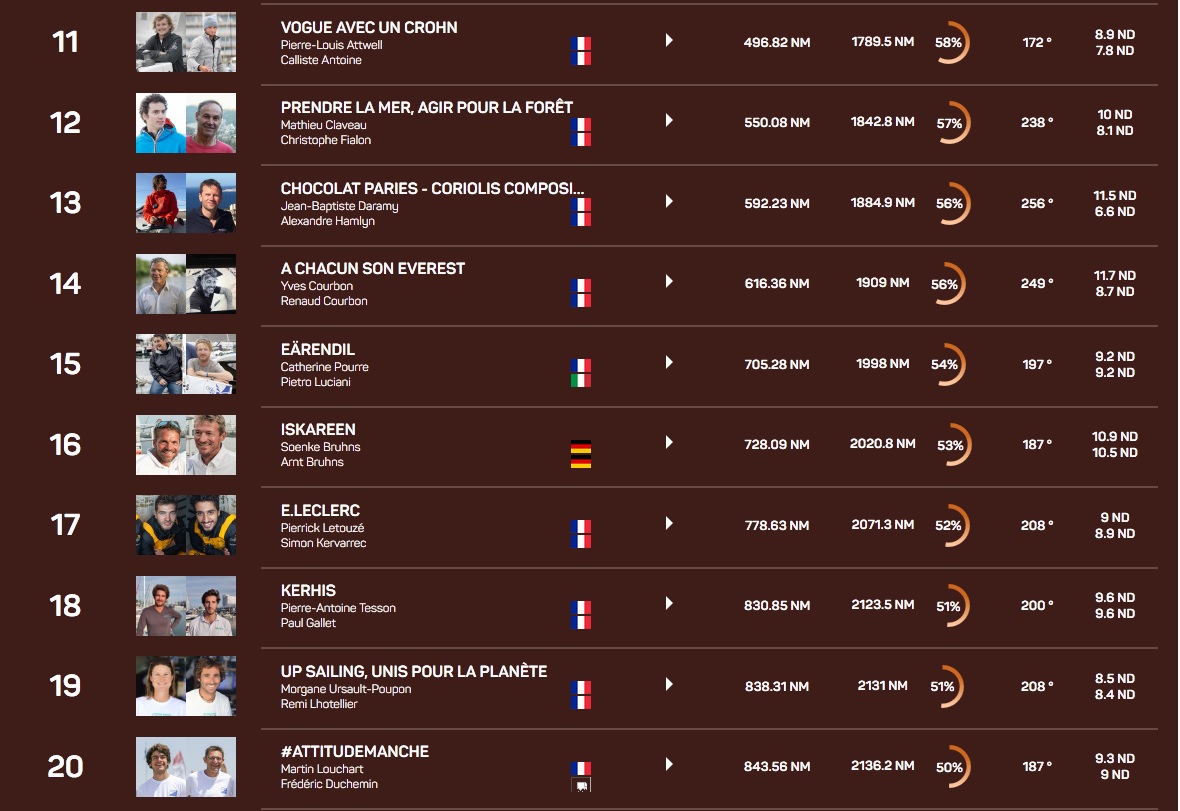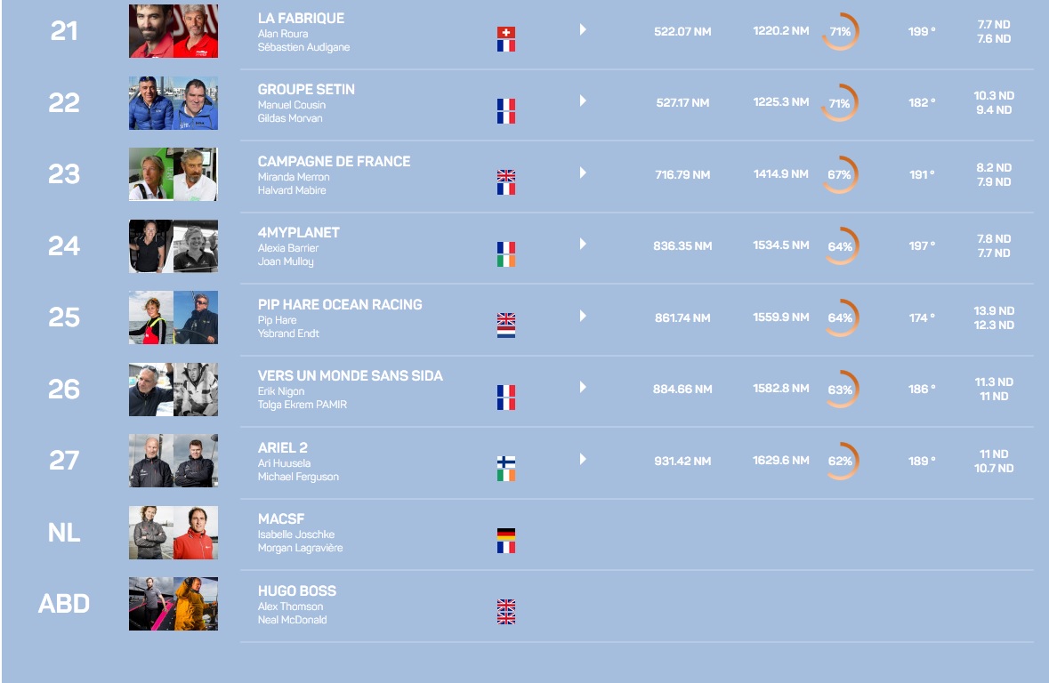 Derrière les leaders, Banque du Léman est toujours quatrième à 174 milles et la flotte se répartie ensuite en deux paquets distincts. L’un mené par Made in Midi évolue au sud du Cap Vert, alors que le deuxième, à la tête duquel Eärendil a signé un joli retour, est encore au nord du 15ème degré de latitude. Equipe Voile Parkinson ferme la marche à 1000 milles des leaders et n’a toujours pas bouclé la moitié du parcours.
