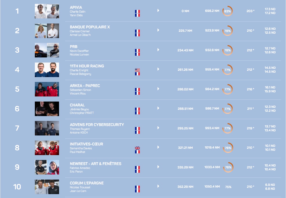 Derrière en revanche, neuf bateaux se tiennent en 90 milles et les places vont être chères sur le podium. Deuxième ce soir, Banque Populaire a probablement mangé son pain blanc. Aux allures qui prédominent sur la fin de parcours, Clarisse Crémer et Arrmel Le Cléac’h auront plus de mal à contenir les assauts des foilers. PRB et 11th Hour Racing se tiennent en dix milles et sont redoutables à cette allure. Cinquième, Charal semble enfin sorti de son calvaire où il aura perdu plus de 350 milles et sans doute pas mal d’énergie. La rage de rejoindre le podium l’emportera-t-elle sur la frustration d’une victoire diluée dans le Pot-au-noir ?
