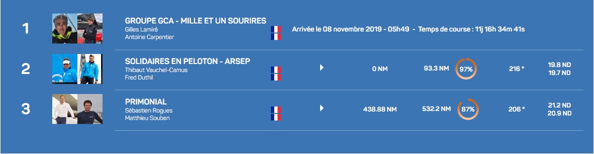 Ce vendredi 8 novembre, à 05h 49mn 4s (heure française), Gilles Lamiré et Antoine Carpentier ont franchi la ligne d’arrivée de la 14e édition de la Transat Jacques Vabre Normandie Le Havre en première position de la catégorie Multi50, avant jury. Le duo aura mis 11 jours 16 h 34 mn et 41s pour parcourir les 4 350 milles théoriques depuis Le Havre à la vitesse moyenne de 15,50 nœuds, mais il a réellement parcouru 4 926 milles à 17,56 nœuds.