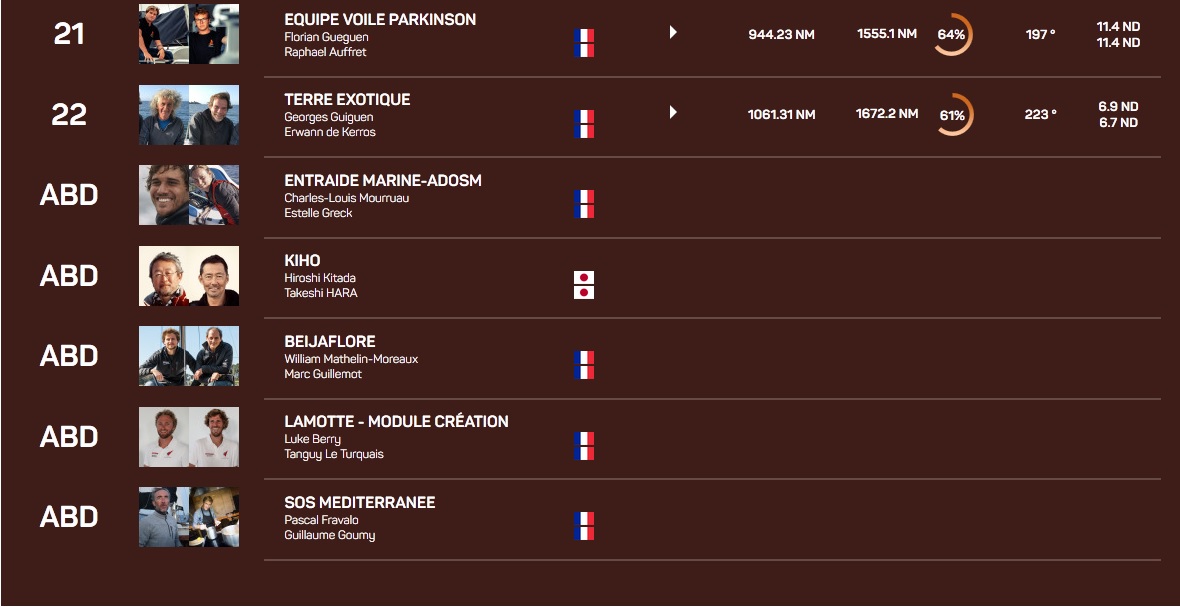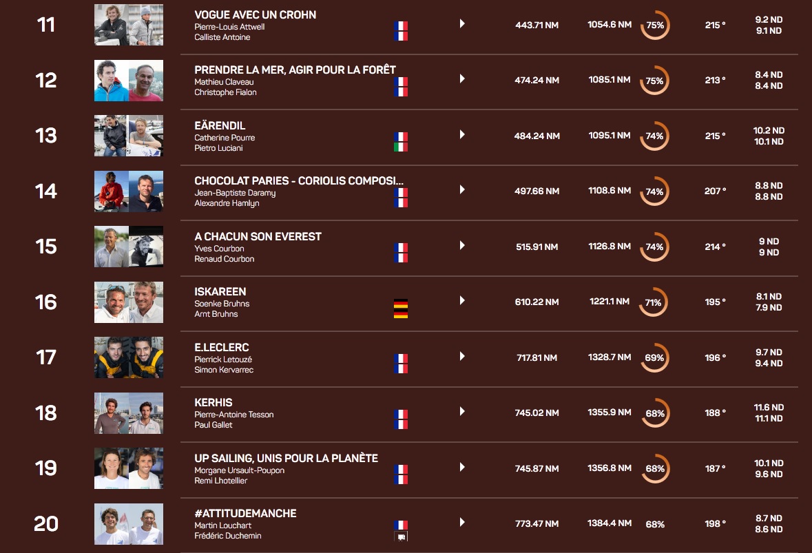 C’est le statu quo chez les Class40 en tête de flotte qui évoluent toujours au près vers Recife. « Nous avons 20-25 nœuds, c’est très humide comme navigation. Le podium est figé mais il faut rester concentré, studieux pour ne rien laisser passer. Le problème, c’est que l’alizé a l’air de rester très sud et qu’on ne va pas tant ouvrir les écoutes que ça ». Toujours en tête, avec un matelas de 64 milles sur Leyton, Crédit Mutuel est encore à plus de 600 milles de l’arrivée qu’il ne devrait pas atteindre avant jeudi soir.