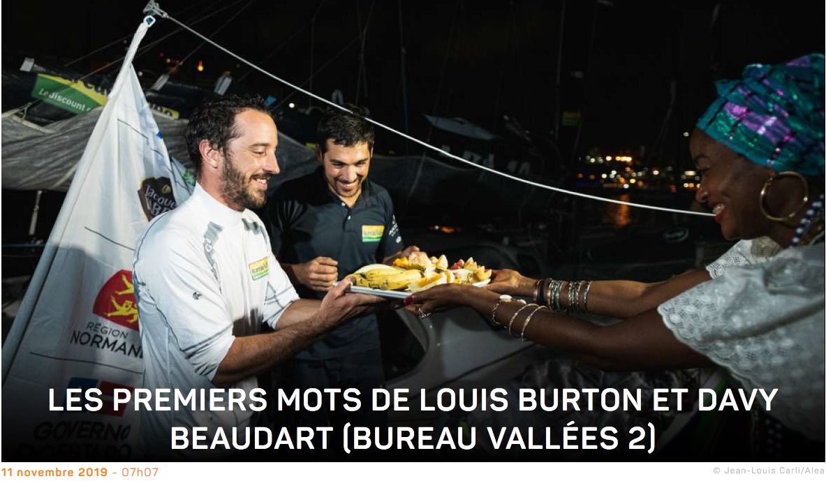 Yannick : « On est content de toucher terre et de vous retrouver après ces 15 jours fantastiques ! On a visité l’Atlantique, on a visité le Pot-au-noir, on a visité la Baie de Bahia, c’était un grand voyage ! A chaque fois qu’on revenait dans le paquet, c’ était une petite victoire. Mais le Pot-au-noir, ça été une deuxième couche. C’est pas comme si on n’avais pas travaillé la météo. On regardait toue les deux heures les images satellites et on a beau dire, ce Pot-au-noir, c’est vraiment une loterie. Celui qui a bien joué, c’est Bureau Vallée qui a bien traversé la flotte pour ressortir à l’Est et qui grapille deux toris places avec le bon angle.