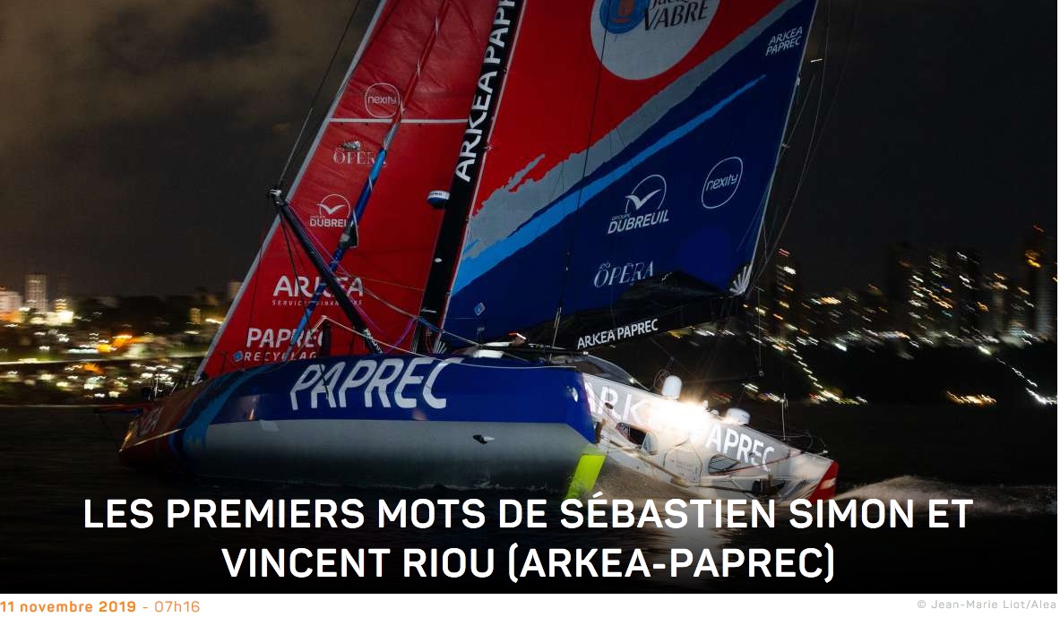 Privé de son foil bâbord avant le départ du Havre, le tout nouvel Arkea-Paprec mis à l’eau en 2019 partait donc pour faire du mieux qu’il pouvait face aux nouveaux foilers Apivia, Charal et Advens for Cybersecurity. Dans le groupe, derrière les leaders Apivia et Charal, Sébastien Simon et Vincent Riou s’accrochent et contiennent les assauts de leurs camarades de jeu (Groupe Apicil, 11th Hour Racing, Corum L’Epargne) en parvenant à conserver la 6e position avant d’attaquer les alizés de nord-est pour descendre jusqu’au Cap Vert. Sixième dans l’ouest de l’île de Santo Antao, Arkea Paprec ressort du Pot-au-noir en 7e position, heureux de pouvoir enfin attaquer les alizés de sud-est bâbord amures, là où il pourra voler sur son foil en état. Vendredi dernier, le 9 novembre, alors que le duo naviguait dans de parfaites conditions de glisse avec une mer plate, le foil tribord s’est cassé net. Difficile alors de contenir les concurrents sur un bateau sans foil qui se trouve un peu déséquilibré. Moins rapides aux allures de reaching, Sébastien et Vincent trouvent le ressort nécessaire pour se battre jusqu’à la ligne d’arrivée à Salvador de Bahia… Le mano a mano avec Bureau Vallée 2 en est le plus exemple : un duel incroyable dans la nuit brésilienne et 14 mn d'écart !