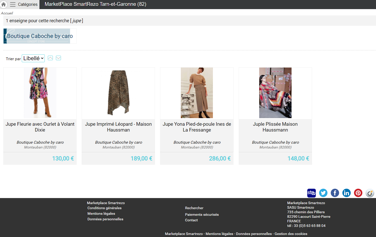 Mais ne restons pas dans le négatif, Smartrezo aimerait pouvoir aider les commerces et les producteurs et cela le plus rapidement possible. Nous sommes en capacité de mettre en ligne des boutiques e-commerce/drive en moins de 4h00 et si des commerçants veulent découvrir de quoi il s’agit, nous les invitons à suivre ce lien et de par exemple taper le produit « jupe » https://www.smartrezo.com/d22-tarn-et-garonne-82/annuaire.html