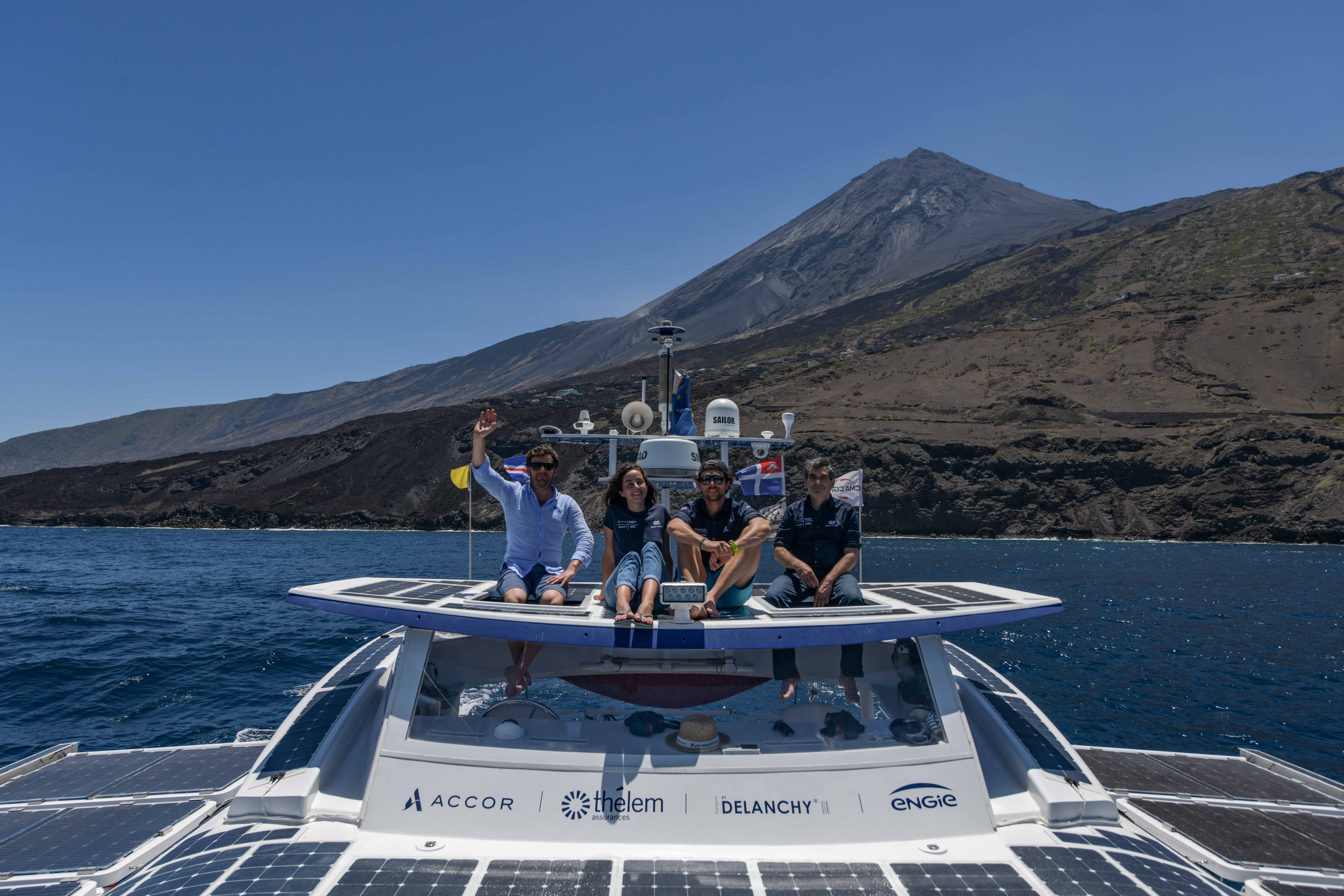 Confinés en mer, les membres de l’équipage n’ont pas pu poser pieds à terre lors de ses escales dans les îles Canaries ou au Cap Vert, se faisant approvisionner en produits frais et à distance aux Canaries. Alors que le monde entier vit une période de confinement inédite, l’équipage confiné en mer a eu la chance de vivre cette traversée en pleine harmonie avec la nature, croisant de nombreuses espèces marines - dauphins, baleines, tortues, raies Manta, au large du Cap-Vert mais également des salpes - tout en produisant leur énergie et leur eau potable grâce au vent, au soleil et à l’hydrogène.