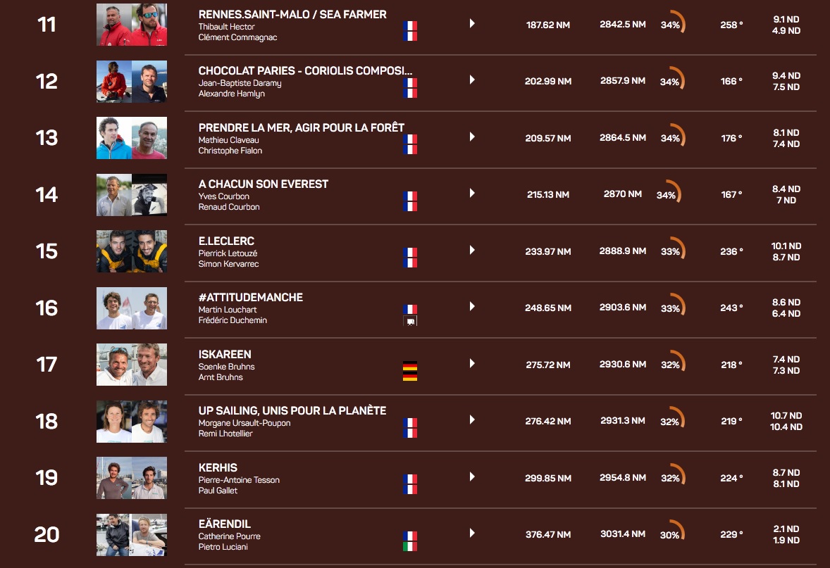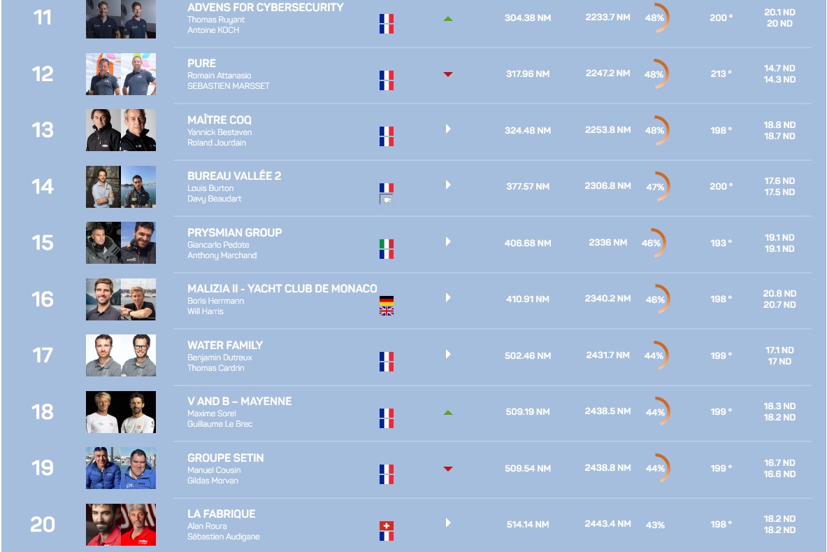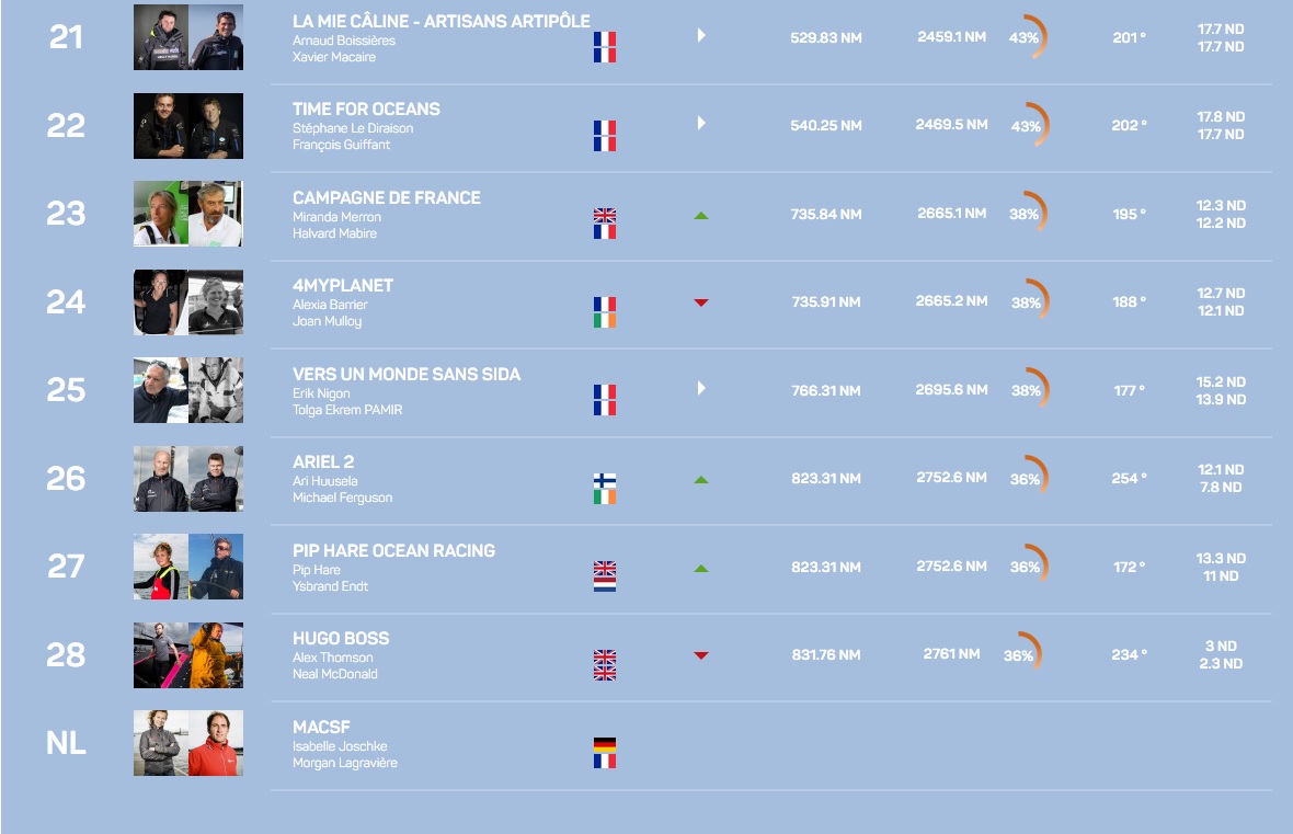 Encore derrière, il y aura du jeu jusqu’au bout autour de la onzième place avec cinq bateaux qui se tiennent en 100 milles et beaucoup d’écart en latéral. A noter aussi le bon retour dans le jeu de VandB Mayenne. Maxime Sorel et Guillaume Lebrec cravachent depuis leur arrêt à Brest lundi dernier. Après avoir doublé Time for Oceans, La Mie Câline Artisans Artipôle et La Fabrique, ils se hissent ce matin à la hauteur de Groupe Sétin et Water Family à la 19ème place…