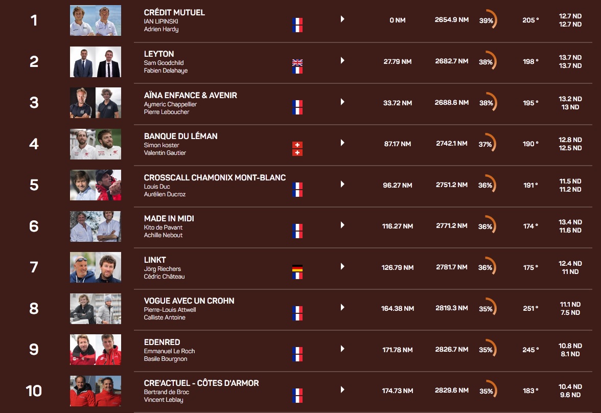 A l’entrée de l’alizé, un groupe de sept bateaux a pris un avantage significatif sur le reste de la flotte. Avantage qui devrait s’accroître au fil de la journée lorsque les vitesses vont augmenter sous spi. A ce jeu, Crédit Mutuel navigue un cran au-dessus de ses adversaires. 25 milles de mieux sur les dernières 24 heures, ça fait tout de même un nœud de moyenne et c’est préoccupant pour le tandem Leyton-Aïna Enfance et Avenir toujours au coude à coude sur le podium. Sans doute que Crédit Mutuel bénéficie d’un peu plus de pression à l’entrée des alizés : « On a 15 -18 noeuds et une mer facile. C’est la troisième nuit idyllique depuis le départ. On n’a pas touché au pilote depuis Ouessant. On s’entend à merveille avec Adrien. L’ambiance est concentrée mais détendue. Les conditions faciles nous permettent de bien échanger, et j’apprends beaucoup à ses côtés ». Beaucoup de sérénité se dégageait du cockpit de Crédit Mutuel ce matin. Les premiers Class40 ont couvert plus d’un tiers du parcours et vont pouvoir accélérer vers le Cap Vert après une première semaine éprouvante. Un peu comme en IMOCA, de petits paquets se forment au sein desquels la régate bat son plein et il faudra attendre que l’ensemble de la flotte ait débordé les Canaries pour établir une hiérarchie fiable au sein de la flotte des 22 duos en route vers Salvador de Bahia.