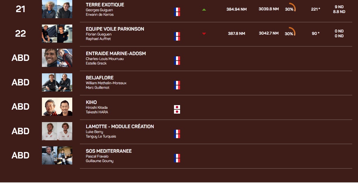 6 abandons : 5 Class40 (Lamotte Module Créations, Beijaflore, SOS Méditerranée, Kiho, Entraide Marine ADOSM), 1 IMOCA (Hugo Boss qui navigue désormais sans quille. Devenue trop dangereuse pour l’intégrité du bateau, donc de l’équipage, Alex Thomson et Neal Mc Donald ont dû la libérer. Ils naviguent avec les foils sortis et le fond ballasté).