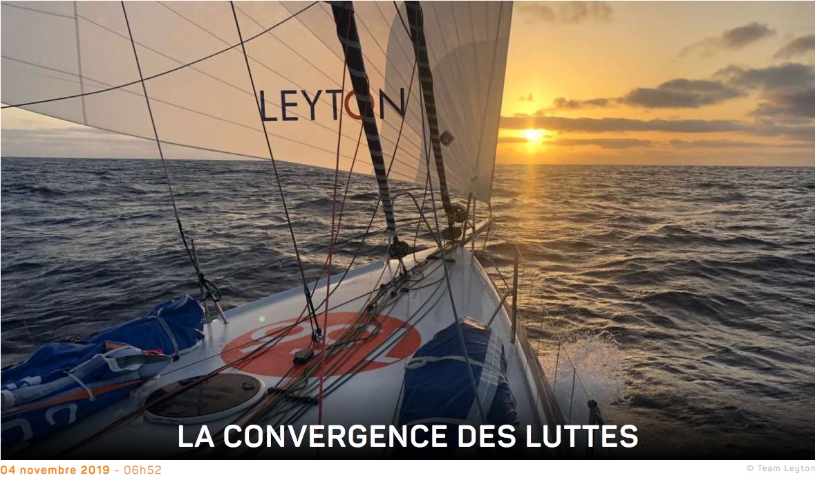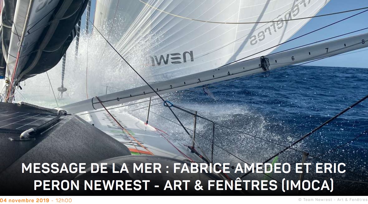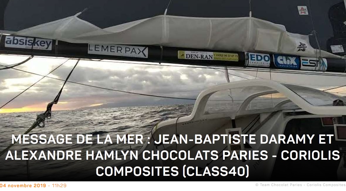 Le tandem Lamiré/Carpentier file bon train à plus de 25 nœuds toujours bâbord amures cap au sud vers le Pot-au-noir dans lequel ils devraient rentrer au fur et à mesure ce soir. Et contrairement aux prévisions d’il y a 5 jours qui annonçaient un pot de pue, la zone se dégonfle, s’essouffle comme pour les laisser passer presque tranquillement, moins vite mais sûrement. Derrière, le bateau bleu de Thibaut Vauchel-Camus et Fred Duthil accuse un retard de plus de 150 milles et suit parfaitement le sillage du leader. Grosse déception du côté de Primonial à 270 milles du deuxième, après son arrêt forcé à Mindelo au Cap Vert. « On a fait une réparation de fortune sinon il fallait attendre la pièce plusieurs jours. Maintenant on démarre le moteur (uniquement pour recharger les batteries, ndlr) en faisant se toucher deux fils ! ». Une course joliment menée jusque-là désormais entre parenthèse pour Sébastien Rogues et Matthieu Souben…