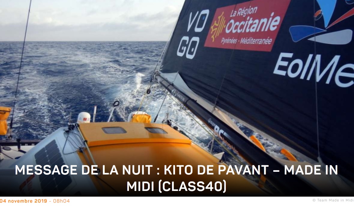 Ça bouge beaucoup à bord et même se faire un café est un exercice particulier. On file toujours vers le sud avec un groupe de 6 bateaux. On a un œil sur les multi 50 qui vont arriver avant nous. On y sera mercredi, ça va arriver vite. On a vu nos premiers poissons volants. En gros ça tartine mais ne me parlez pas de Nutella ni de confiture, et encore moins de l’éclair au chocolat, ça me fait trop envie ! »